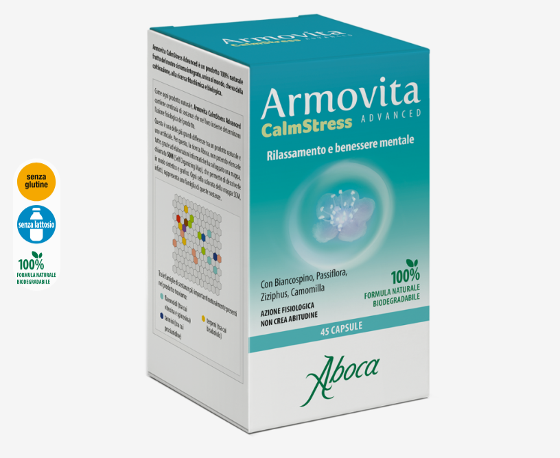 Armovita CalmStress Advanced è utile per favorire il rilassamento e il benessere mentale grazie alla sinergia di Biancospino, Passiflora, Ziziphus e Camomilla.