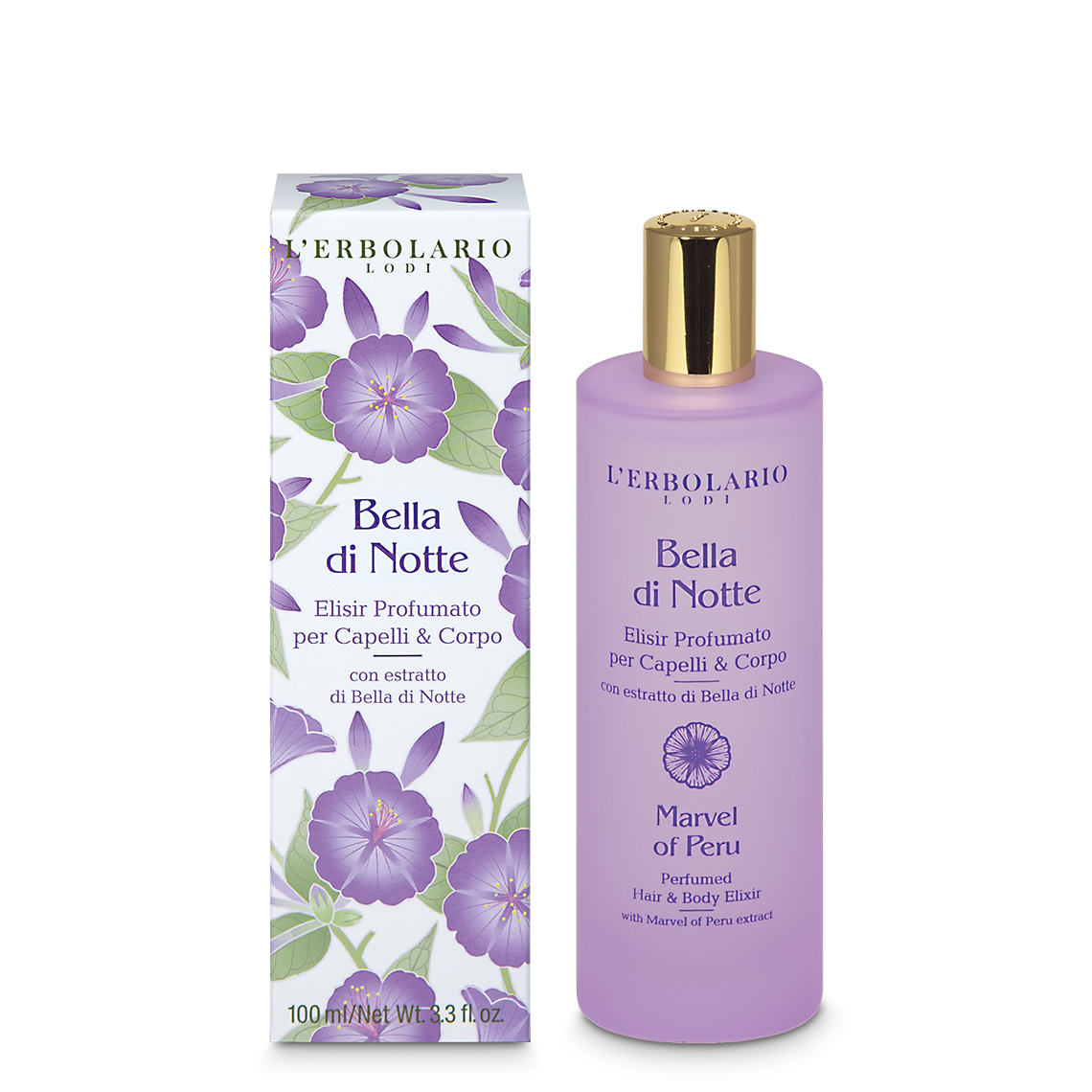 Leggero e impalpabile, questo spray profumato può essere vaporizzato sia sulla pelle del corpo che sulle lunghezze dei capelli per avvolgerli in una fragrante scia dalle note fiorite e vanigliate. Contiene estratto di Bella di Notte, dalle proprietà antidisidratanti e addolcenti sulla pelle, e Pantenolo quaternizzato, che svolge un’azione districante e volumizzante sui capelli.