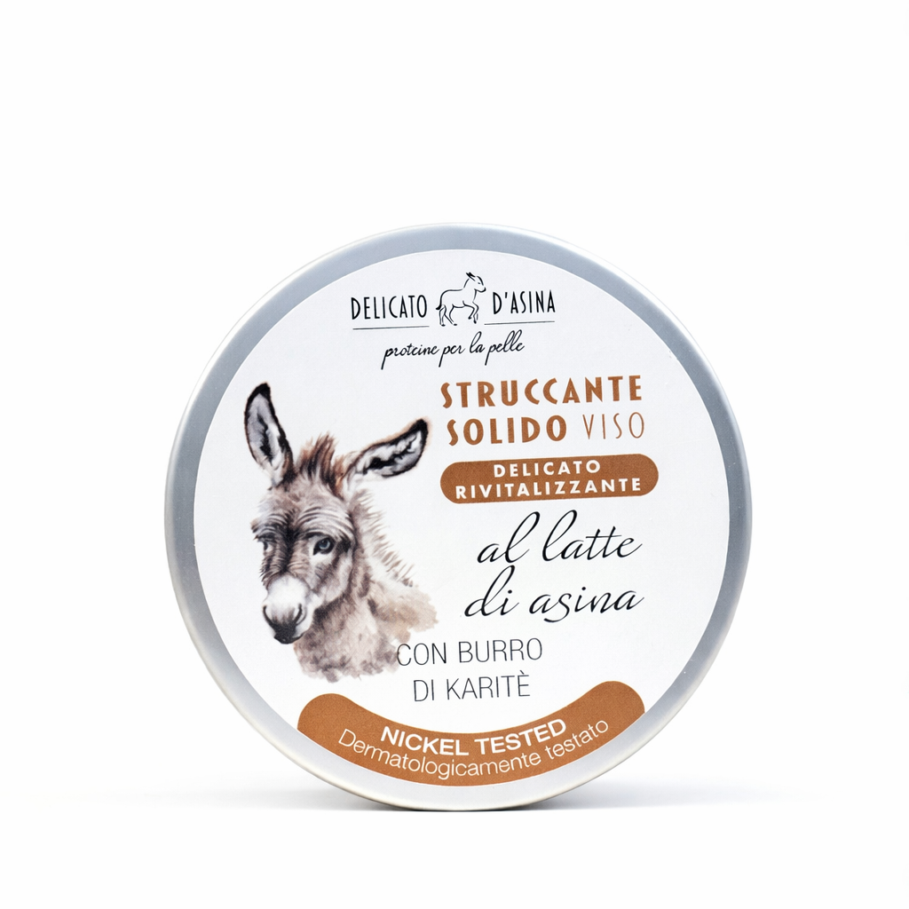 STRUCCANTE VISO SOLIDO DELICATO RIVITALIZZANTE AL LATTE D’ASINA, dalla formula delicata, realizzato con tensioattivi di origine vegetale derivati dal’olio di cocco. A contatto con l’acqua sprigiona una schiuma morbida e cremosa che deterge dolcemente la pelle, alutando a rimuovere il trucco.